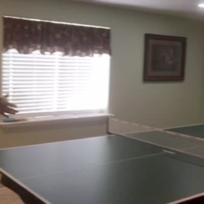 A young boy falls off of a chair in a game room when he swings at a ping pong ball while he plays against his teen brother.
