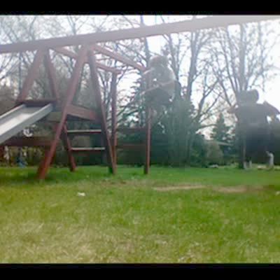 Boy swings on metal folding chair in swing in backyard, tries to flip out of swing, metal chair hits him in head, knocks him to ground.