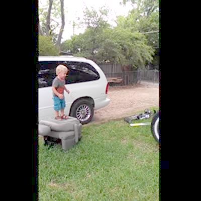 A tot boy climbs on a chair in the front yard and attempts to jump onto a tire swing but face plants. Action:30