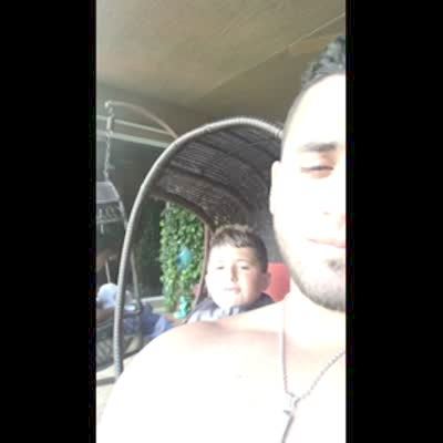 A man and a young boy go back and forth and call each other ugly. Another young boy swings in a chair behind them. He chair swings too far and he falls over in a yard.