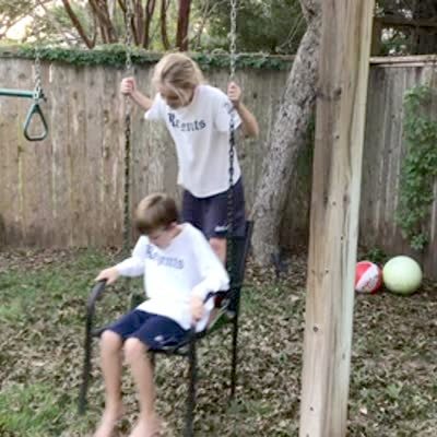 A young boy and young girl sing in a chair attached to chains and it breaks and the young boy falls.