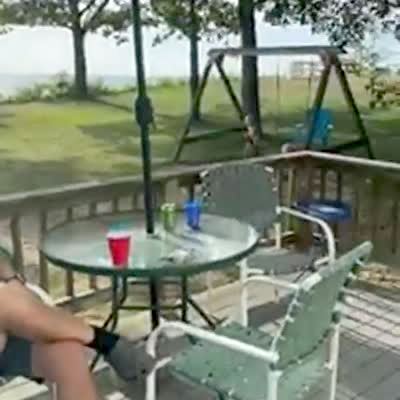A man talks on the phone when he loses his balance on a chair swing and falls backwards from a patio to a backyard. Security footage.
