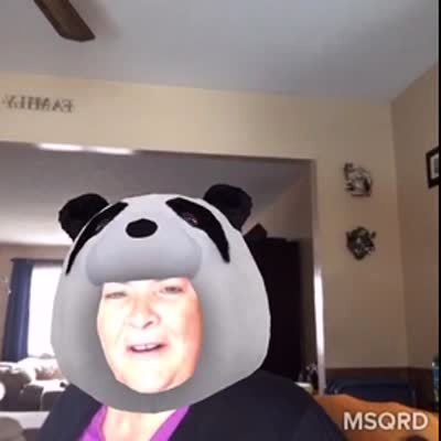A woman makes noises and laughs as her face changes using the MSQRD app on a phone.