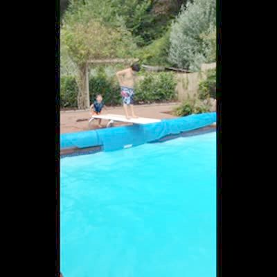 A chubby young boy runs on a diving board over a swimming pool outdoors, slips, hits his head, and falls in.