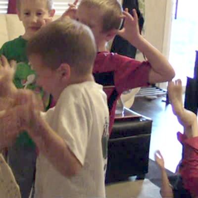 A baby girl sits on her dads lap in the living room as her four brothers pretend to attack her with wooden sticks and she hits them with nun chucks.