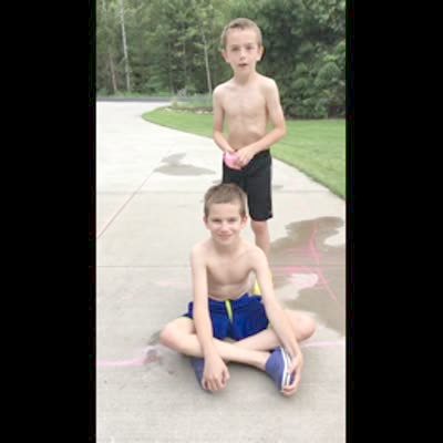 A teen boy knocks at a deck with a hammer and accidentally throws the hammer at the man holding the camera.