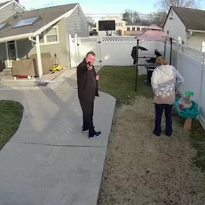 A rabbit runs past a man while he smokes a cigarette outside, and he screams loudly and jumps, then claims that a big-ass raccoon ran at him. His teen boy son comes out and asks if it was the rabbit, and the father says "no." Security footage.