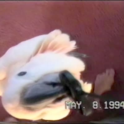 A cockatiel bird plays peek-a-boo behind a La Croix can with a variety of sound effects in the living room.