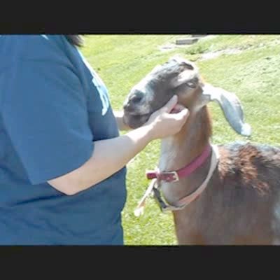 A goat walks around in a Cheerleader Halloween costume. A dog starts to follow and then runs away.