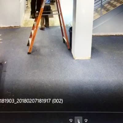 A man falls off of a ladder and hits his head into a wall. Security Cam.