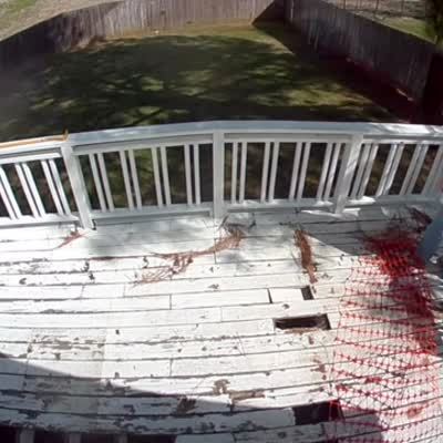 A man falls through a broken joist when he repairs a wooden deck. Security footage.