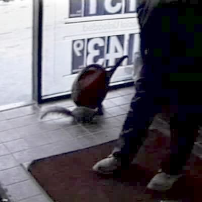 Man falls from ceiling of convenience store. Security / surveillance camera footage. NO AUDIO.