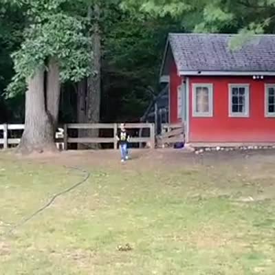 A young boy opens as chicken coop in the backyard and gets chased across the grass by a bunch of chickens.