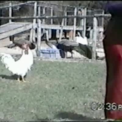 A woman walks out of a chicken coop with eggs and comments how well the chicken birds behaved, then a rooster runs at her, and eggs spill everywhere.