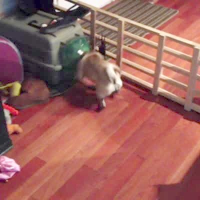 A dog stands up on his hind legs but falls over onto his pen fence and knocks it over. Security footage.