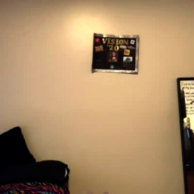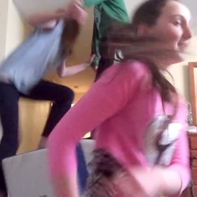 A teen girl climbs on top of two crates in the bedroom, and falls off of them.