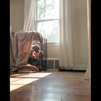 A dog runs away from a man and lies down in a kennel crate whenever he asks if she wants to take a bath.