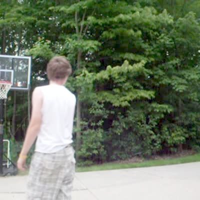 Two teen boys shoot basketballs, one boy throws the ball hard at the other's groin / crotch.