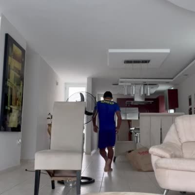 A boy uses an exercise belt indoors and hits himself in the crotch by mistake, amusing the woman behind the camera.