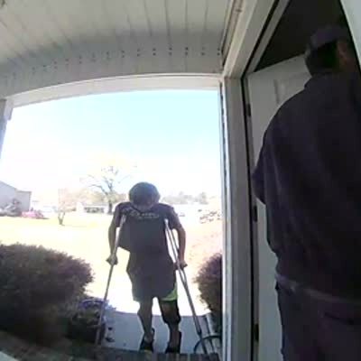 A young boy struggles to go up a front step of his house on crutches and falls down. Home security footage.