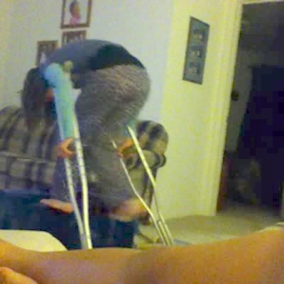 A teen boy holds himself up to balance on a pair of crutches repeatedly indoors before he loses his balance and falls down. Vine/instagram.