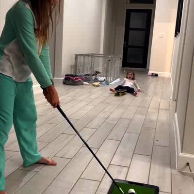 A young girl hits golf ball in home and hits her sister in the forehead.
