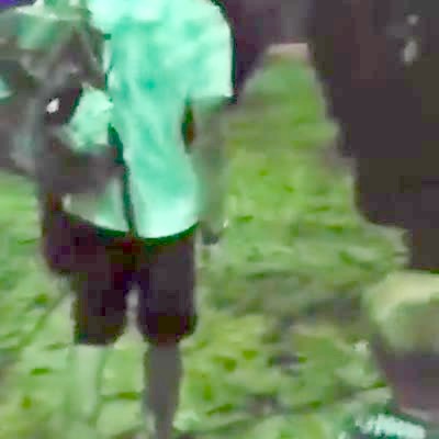 A young boy falls head-first into a flower pot in a front yard, and a young boy laughs while a woman comes out to help him. Security footage.
