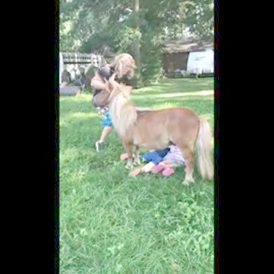 A young boy and girl pose for a picture on a pony horse and they fall off of its back.