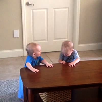 A young boy laughs at another toddler at home when the second boy shakes his head and pretends to hit it on a table. The second boy then actually hits his head and begins to cry.