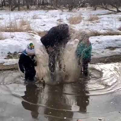 A woman jumps in a deep puddle with a tot boy and a young girl, in slow motion, but she causes a large splash that hits all three of them in the face.