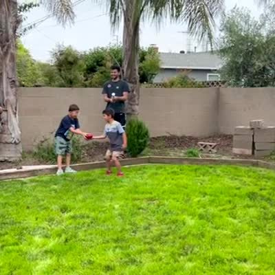 Young kids give each other a powder ball for a gender reveal in a backyard. Then a young boy kicks the ball. It hits his younger brother in the head, covering him in blue powder.