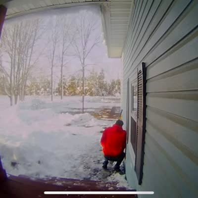 A man slips going up porch icy steps and falls to the ground. A young boy comes out to check out what happened then the young boy also slips down the steps.