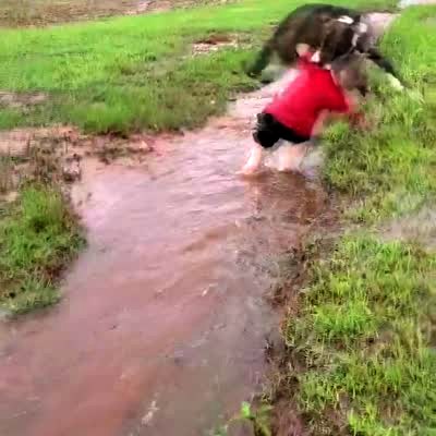 A dog runs into a young boy twice and knocks him into a muddy puddle in a field. The child is upset.
