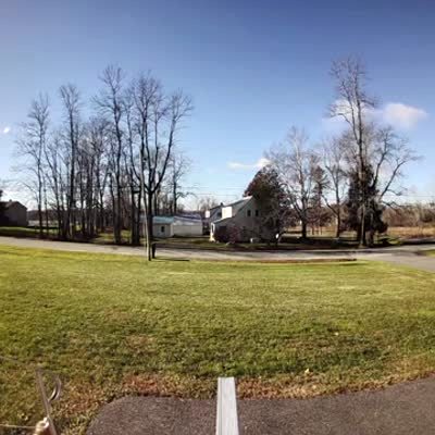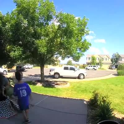 A young boy gets swung and flung onto the yard, as he tries to exit a front porch door. Security footage.
