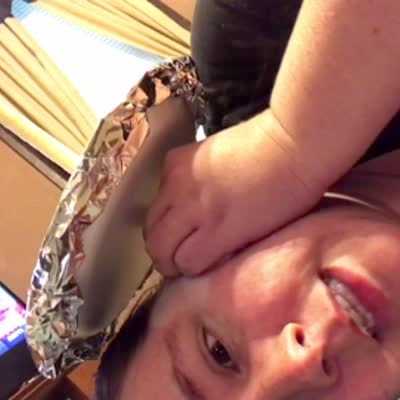 A baby girl cries in a living room. Her uncle puts a blanket over her, and she stops, but she starts again each time he moves the blanket.