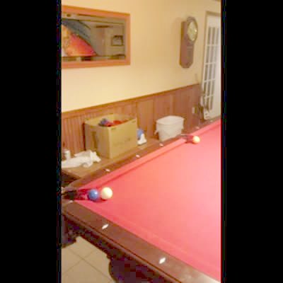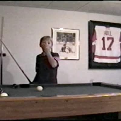 Two teen boys play pool in a garage. On the very last shot, one boy hits the ball with the cue and the ball flies off the table and hits the other boy in the groin. Security Camera Footage.