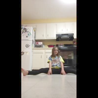 A girl does a gymnastics handstand indoors when her dad walks in front of her and farts in her face.