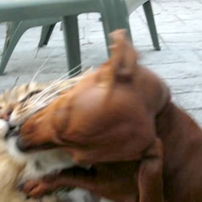 Dachshund is biting at cat's face on the patio. He's cleaning the cat's teeth.