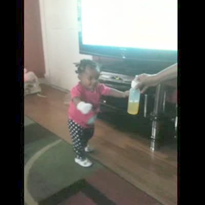 A baby girl taking her first steps to get a bottle is denied when a tot boy runs to grab it from her hands.