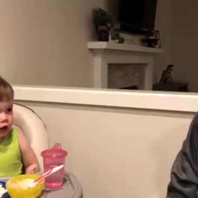 Twin tot boys laugh hysterically as their dad burps and one boy asks him for more at a dinner table.