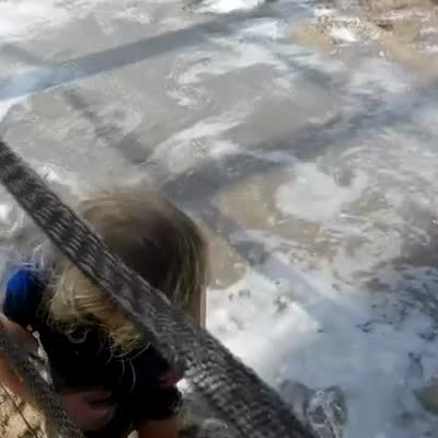 A young girl drives a Power Wheels Jeep up a ramp and crashes face first into a puddle of mud.