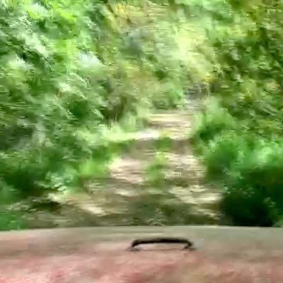 A man and teen boy drive a car through a muddy puddle in a forest at around 0:38 and the car gets soaked in. The man laughs and the teen boy looks upset.