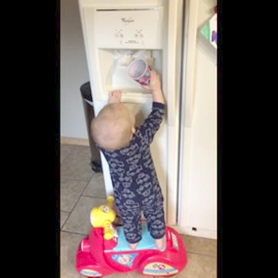 A tot boy tries to get water from a dispenser in a refrigerator. He pours a cup of water on his face and then falls down.
