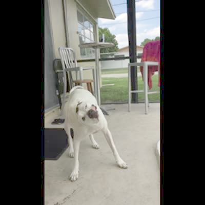 A dog shakes his head and flops his ears and lips in slow motion on the patio outdoors.
