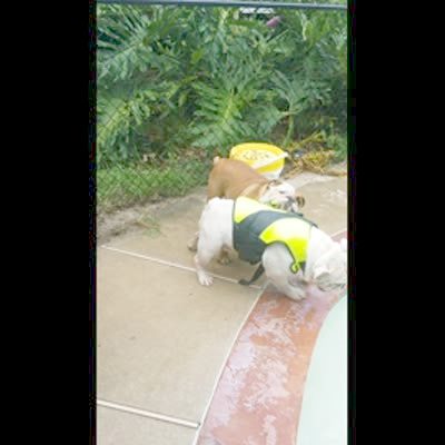 A bulldog dog pulls another dog out of a swimming pool and won't let the dog back in the pool.