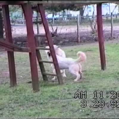 DOG. One dog won't let other climb up ladder of slide, pulls tail.