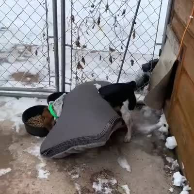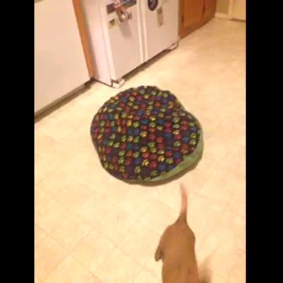 A dog hides under a doggy bed and watches another dog eat food. When the dog finishes eating, the dog in hiding walks over and starts eating. Start around 1:00.