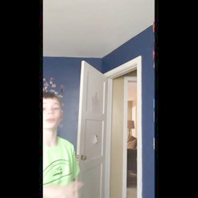A boy calls his mom into the room and she crashes into clear tape stretched across the door frame.