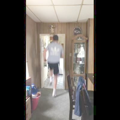 A teen boy runs and jumps into a door frame as he dances in a house.