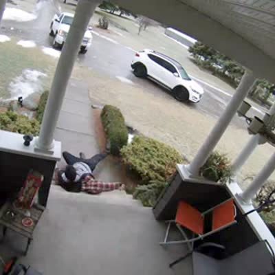 A young man walks out the front door of a house then slips and falls down the front stairs and slides on the walk way.